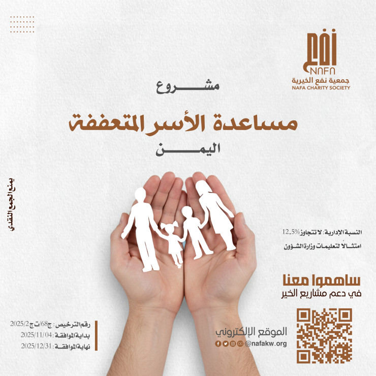 في هذا الشهر المبارك، ما زال هناك من ينتظر يدًا تمتد إليه لتخفف عنه ضيق الحياة.بكفالة بسيطة، قد تفرّج كربة أسرة، وتعيد الأمل لقلبٍ أثقله الهم.ربما مبلغ صغير منك يكون سببًا في طعامٍ لعائلة، أو دواءٍ لمريض، أو سترٍ لمحتاج.✨ قال النبي ﷺ:"من فرّج عن مسلم كربة من كرب الدنيا، فرّج الله عنه كربة من كرب يوم القيامة."ساهم معنا في كفالات شهر 3، وكن سببًا في رسم ابتسامة وبثّ الطمأنينة...