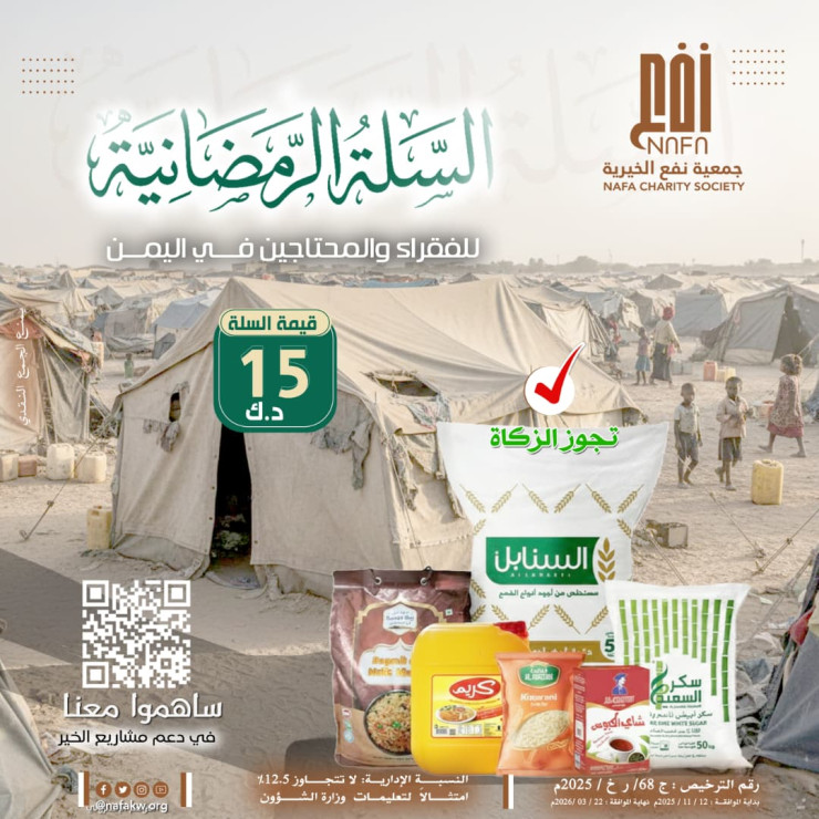 iانطلاقًا من رسالتها الإنسانية ودورها في دعم الأسر المتعففة،تطلق جمعية نفع الخيرية حملة السلة الرمضانية لتوفير سلال غذائية للأسر المحتاجة في شهر رمضان المبارك،تخفيفًا لمعاناتهم في الشهر الفضيلوترسيخًا لقيم التكافل الاجتماعي.قال تعالى:﴿وَمَا تُقَدِّمُوا لِأَنفُسِكُم مِّنْ خَيْرٍ تَجِدُوهُ عِندَ اللَّهِ﴾[البقرة: 110]وتدعو الجمعية أهل الخير للمساهمة في دعم هذه الحملة،فبالعطاء تستمر الرسالة، ويصل الأثر لمستحقيه.
